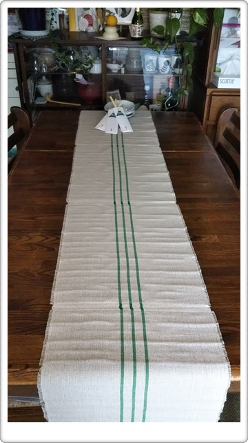 私がパソコンで作った箸袋(A4サイズで2枚完成)を義母が切り、折ってくれました。 テーブルマットは、娘からの贈り物 私の大好きな緑色のラインが素敵・・・ |