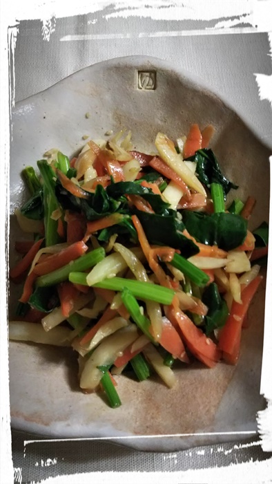 カブの皮、大根の皮、人参の皮、 何でも、皮は、きんぴらに 残った緑の葉物を加えれば、 ほ〜〜ら、美味しそう |