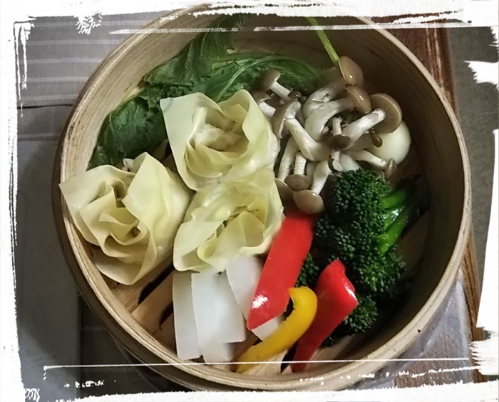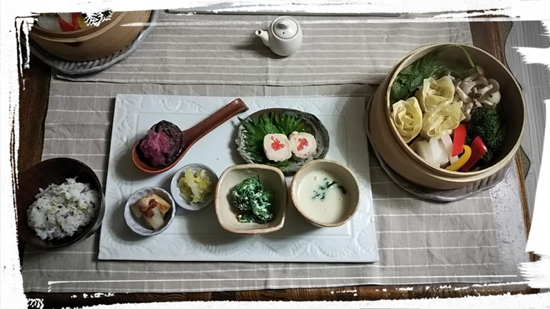 お友達御膳(1) お友達が遊びに来てくれる晩ご飯は、 セイロ蒸しがメインになります。 薔薇の形の焼売で、ちょっぴりエレガントに(笑) 大きな大根が手にはいったら、必ず作るメニューの一つ 「大根のポタージュ」は、身体が温まります。 |