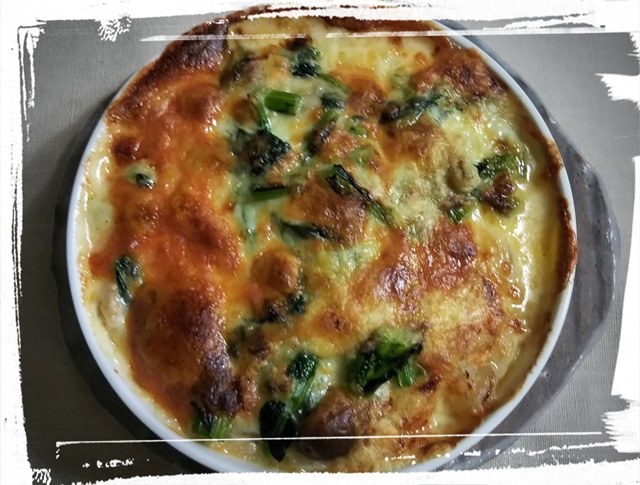 野菜グラタン 冷蔵庫にある野菜で作るグラタン この日は、ブロッコリーと・レンコン・ジャガイモ・玉ねぎ・白菜 ソースは、豆乳と茅乃舎さんの野菜だし |
