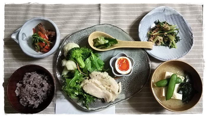 お友達御膳(2) 娘から教えてもらった「簡単蒸し鶏」 塩麹、コショウ、オリーブオイルに漬けたムネ肉を 1分沸騰した鍋に入れて、後は、火を消して一晩そのまま・・・ そのままでもよし。 細かくして、葉野菜と一緒にあえ物にしてよし。 サンドイッチも、オムレツも、色々と楽しめます。 |