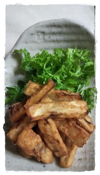 大根の唐揚げ セイロで大根を蒸し、醤油とみりんのつけ汁に1時間ほど付けてから 片栗粉をまぶして揚げます。 おかずにも、おやつにも美味しいです。 ほくほくの熱々もよし。 冷めてもよし。 大きな大根が手にはいったら、必ず作るメニューの内の一つです。 |