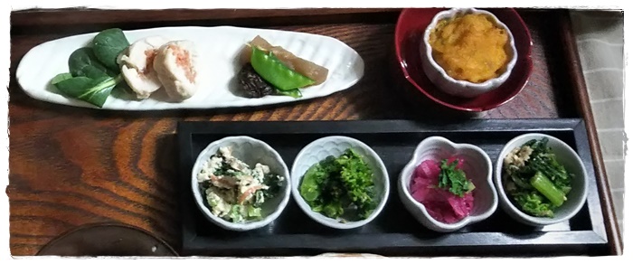 お友達御膳(3) やっぱり、今日もセイロ蒸しがメインになりました。 後は、冷蔵庫にあった野菜をつかって、 ちいさなメニューを並べてみました。 白和え、菜花の胡麻和え、紅大根の酢の物、小松菜のツナ和え 鶏ハムを芯に人参の千切りを入れてクルクル巻いて作ると、 色も鮮やかで見た目も綺麗な一品に・・・ デザートは「スウィートかぼちゃ」 かぶのポタージュにトマトを入れて・・・ |