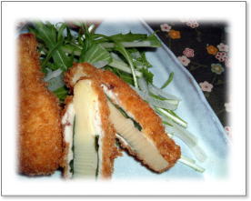 ![]() 長いアスパラのまま、 豚バラ薄切りを巻き、衣を付けて揚げる キャベツと茹でブロッコリーを添えて・・・ |