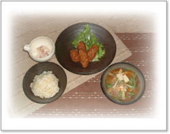 「安曇野豆腐の冷豚しゃぶしゃぶ」 万能ねぎとごまだれで・・・ 「じゃがいもとゴマ入り肉団子」 過去に買い求めた阿久津真希氏の器たちと一緒に・・・ 「野菜あんかけと茶碗蒸し 春雨スープ」 たっぷりの野菜と玄米 ドライトマトときのこと大根葉のスパゲティ にんにく・しいたけ・しめぎをたっぷりと入れ、 仕上げに「大根の葉」もたっぷりと・・・ 〜そば粉入りうどん風スパゲティ〜という感じ 大根と油揚と万能ねぎの味噌汁 |