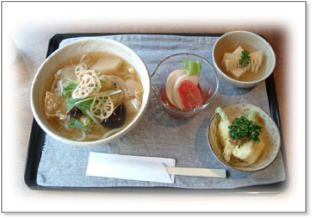 「葛うどんと3品セット」 ![]() 野菜たっぷりうどん トマトとカブのサラダ 高野豆腐と筍煮 カブの天ぷら(味噌・カブの葉のせ) |