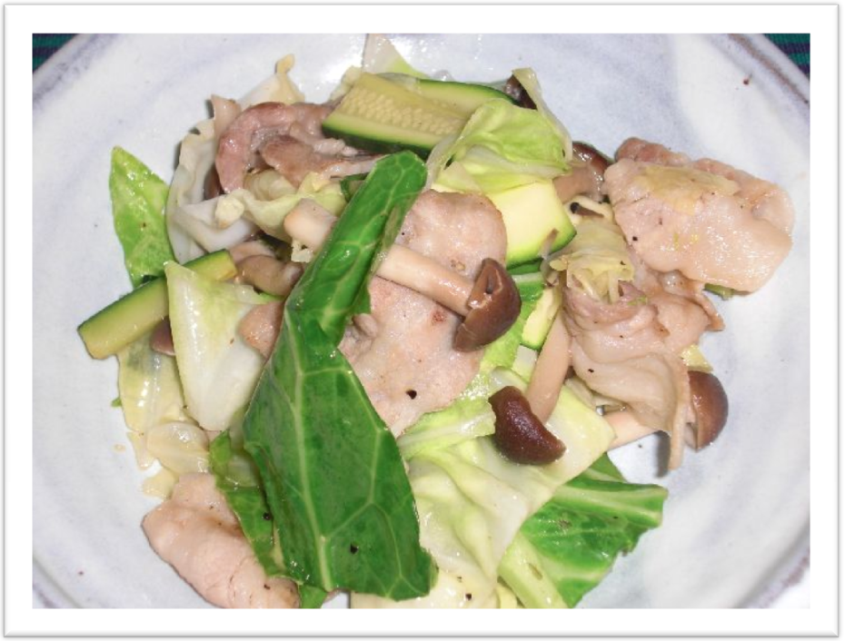 | ズッキーニとしめじ、 キャベツは豚ロース薄切りと さっと塩コショウでいためて・・・ |