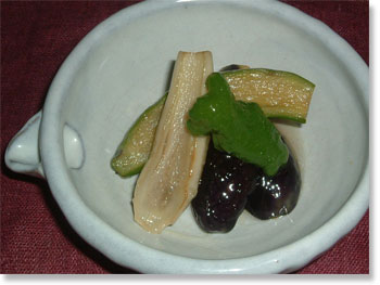 「三色なすの揚げ煮浸し」 (ピーマン添え) 揚げたてのなすを白だしに付けて、 冷たく冷やしていただきます。 見た目ほど、脂っこくなく、 暑い夏、疲れきった体も気持ちも、 これでばっちり! |