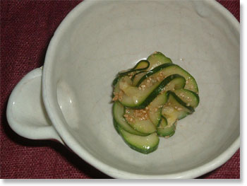 「ズッキーニのナムル」 我が家の人気定番メニュー にんにくをちょっと利かせて 夏バテ対策!! 擂りたてのゴマの香りと香ばしさは 食欲をそそります! (反対に危険です(^^ゞ) |
