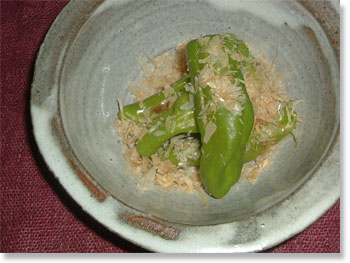 「ししとうのお浸し」 シンプル イズ ベスト! さっぱりと、ぴりっと・・・ 歯ごたえがあるくらいにしゃきっと茹でて ポン酢でいただきます。 |